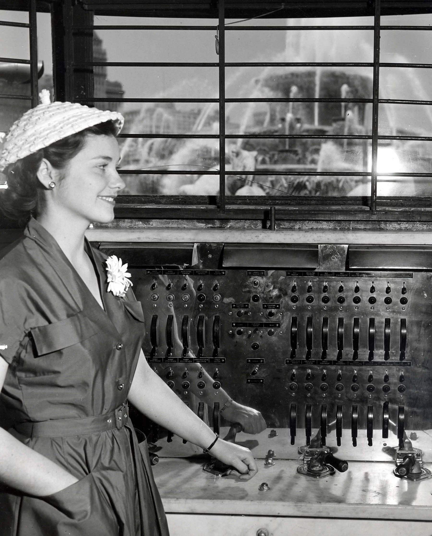 Winner of London’s 1953 “Most Perfect Secretary,” contest in the control room showing the dimmers and levers used to mechanically operate the fountain. Chicago Park District Records: Photographs, Special Collections, Chicago Public Library.
