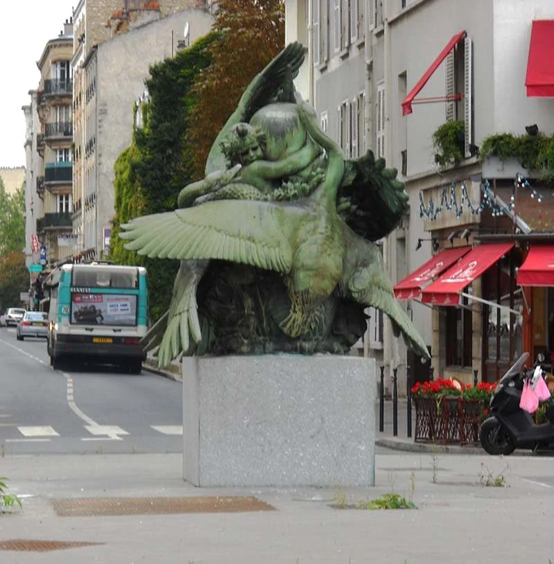 Exhibitted at the Exposition des arts décoratifs in 1925, Marcel Loyau’s bronze sculpture Fontaine des Cygnes now sits at the center of a rondpoint at the Place Denfert Rochereau in the suburb of Boulogne Billancourt. Photo courtesy of Wikicommons.