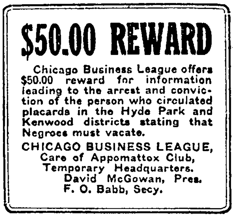 During the 1910s, many members of Chicago’s growing African-American community sought to live in neighborhoods such as Hyde Park and Woodlawn. The city’s black population of 40,000 in 1910 had more than doubled a decade later, during the early years of the Great Migration. A large percentage of the African-American population was concentrated in the Grand Boulevard neighborhood (also called Bronzeville). African-Americans who had escaped the Jim Crow South often found good jobs in Chicago, but when they aspired to buy or rent in neighborhoods just south of Bronzeville, they were generally met with resistance, animosity, and even violence from white residents. According to the Negro in Chicago, a major study published in 1922 by the Illinois Commission on Race Relations, the Hyde Park Kenwood Property Owners’ Association launched a vitriolic campaign to “make Hyde Park white.”