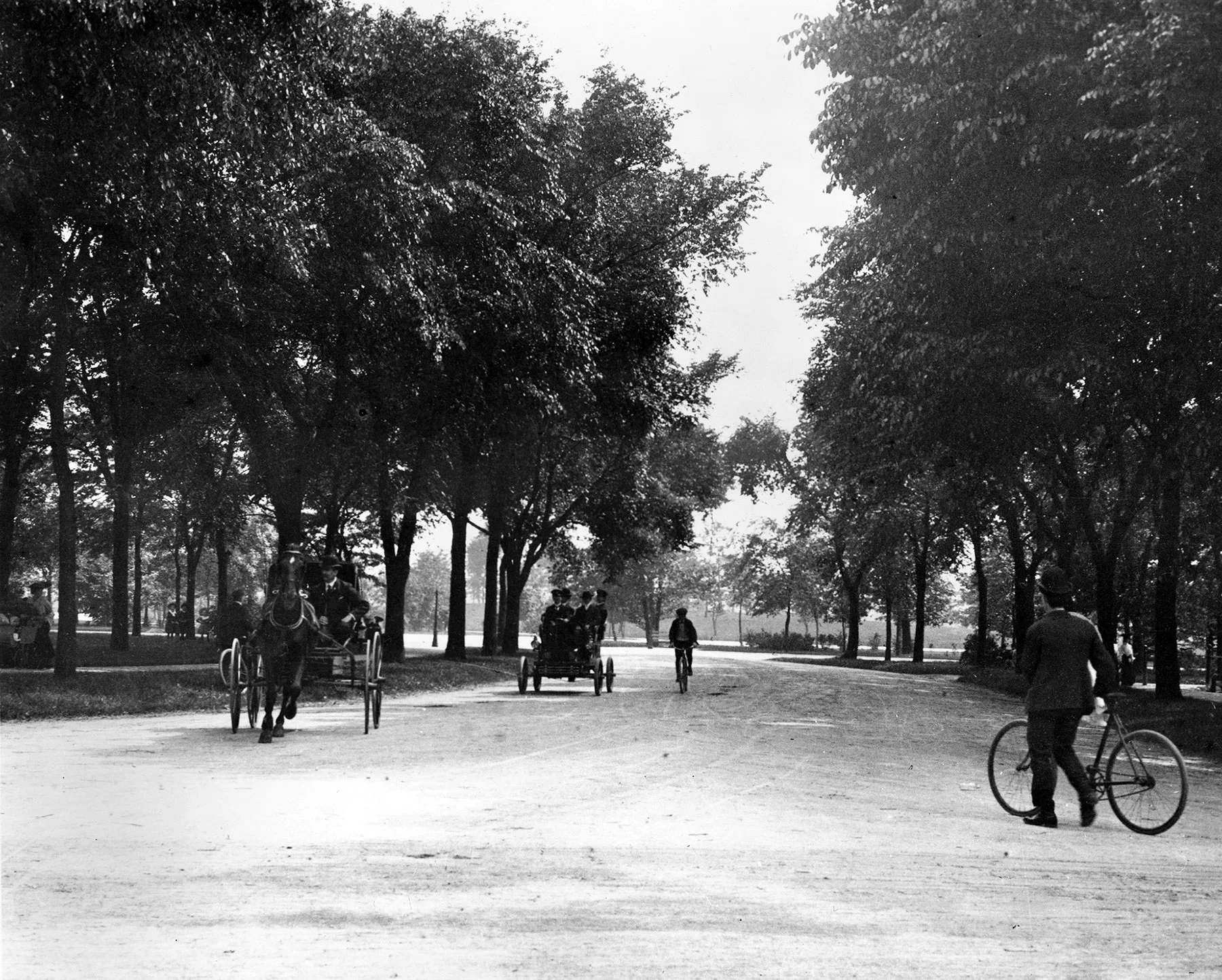 By the mid-1890s, bicycles often shared park roads with horses and carriages, as shown in this photo of Garfield Park, ca. 1895. Courtesy of Chicago History Museum iCHi-51168.