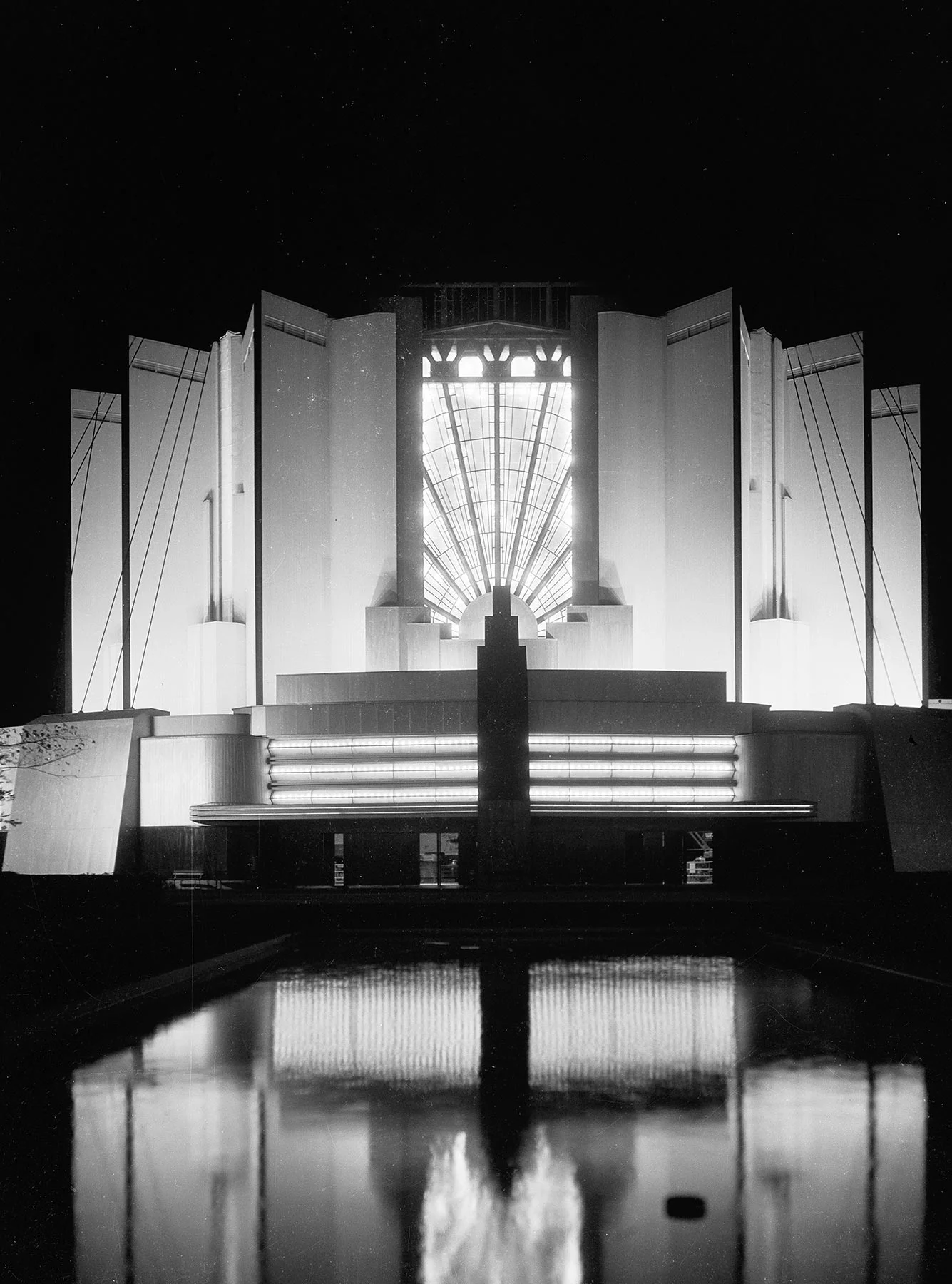 Travel and Transport Building at night with lighting effects. Chicago Park District Records: Photographs, Special Collections, Chicago Public Library.