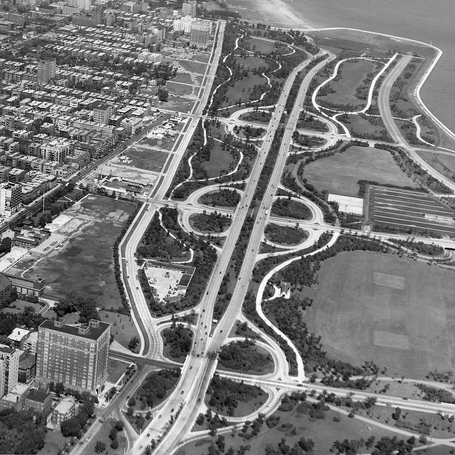 Aerial view of Lincoln Park Extension with 4300 N. Marine Drive at lower left, ca. 1940. Chicago Public Library Special Collections, Chicago Park District Archives, Photos.