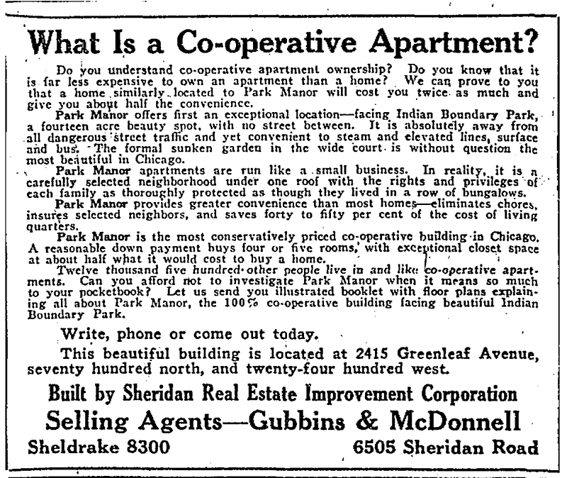 Chicagoans Earl G. Gubbins and Allan E. McDonnell formed a real estate firm around 1920. Sometimes referred to as the Sheridan Real Estate Improvement Association, Gubbins & McDonnell operated out of an office at 6505 N. Sheridan Road. First serving mainly as real estate brokers, the firm soon began developing its own buildings. Gubbins & McDonnell built several lovely bungalows near Indian Boundary Park, including Allan McDonnell’s own home at 2453 W. Coyle Avenue. But it was co-operative apartment buildings that quickly became the firm’s specialty. Tenant-owned co-operative apartment buildings were relatively rare in Chicago until the early 1920s, when Illinois law allowed for the formation of corporations specifically to purchase and improve real estate. As Neil Harris explains in Chicago’s Apartments: A Century of Lakefront Luxury, once such real estate corporations were permissible, co-operative ventures quickly became “a dominant type in the luxury market.”