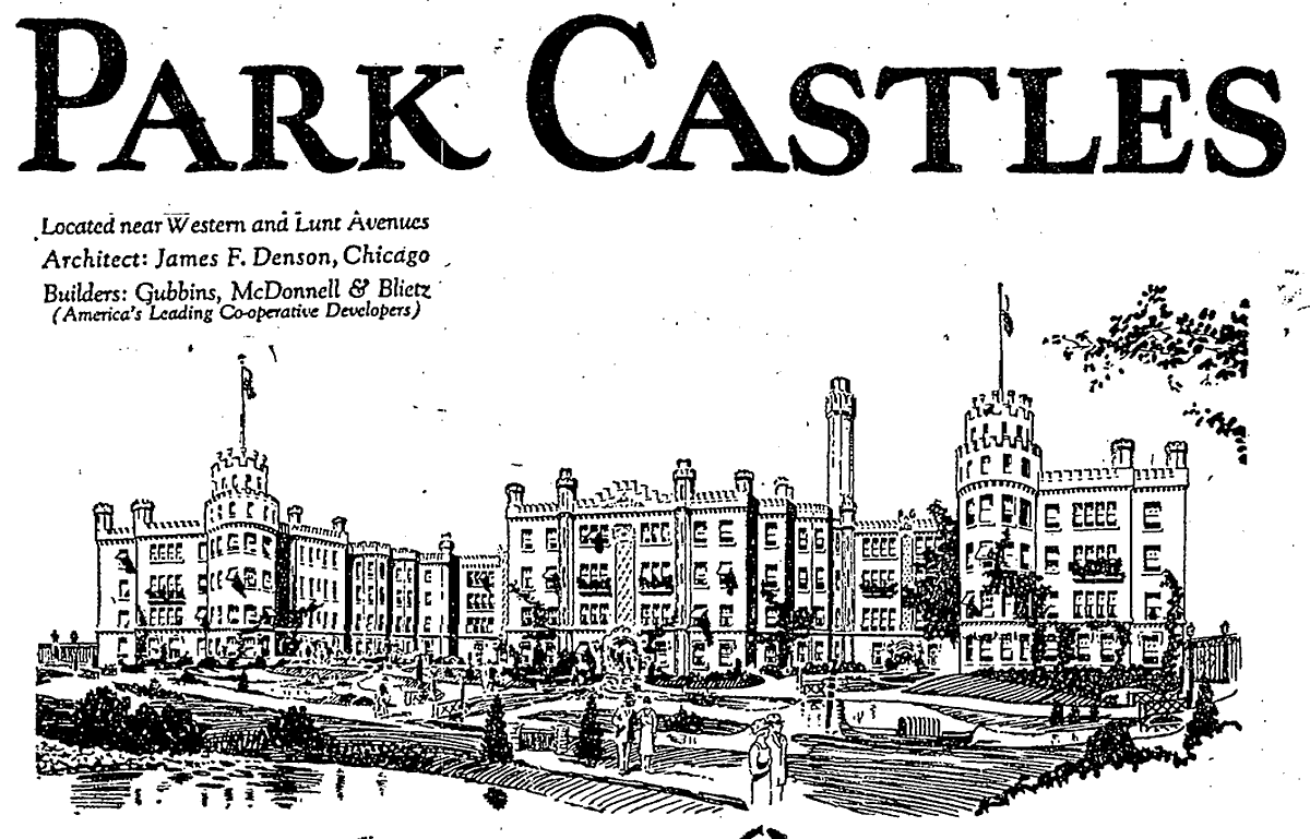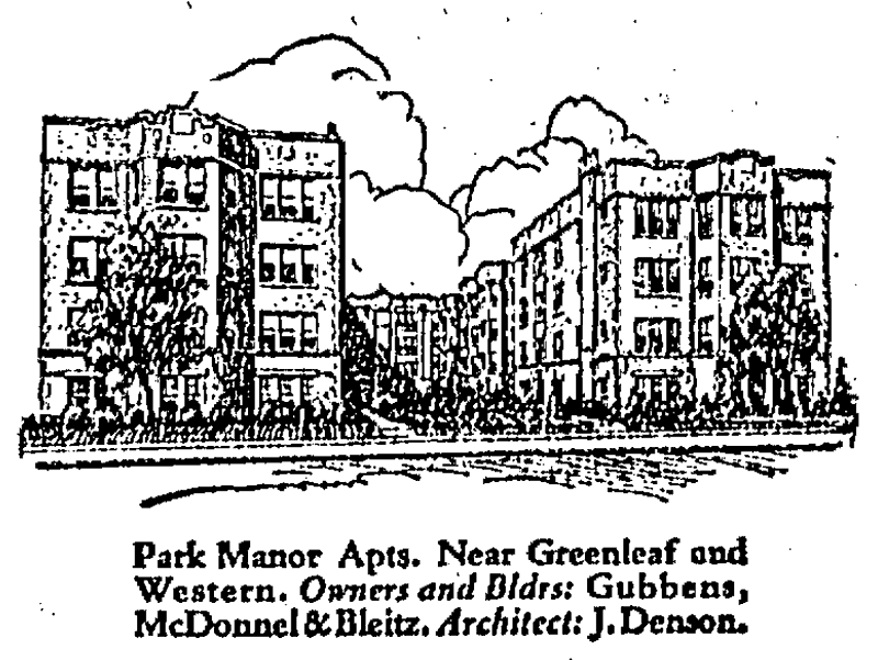 Gubbins & McDonnell hired architect James F. Denson to design their Park Manor and Park Crest co-operative buildings. Although both Chicago’s Historic Resources Survey and the AIA Guide to Chicago Architecture attribute the Park Crest to Denson, these sources credit architect Melville Grossman with the Park Manor’s design. The Park Manor attribution is apparently based upon the Chicago building permit, on which “Grossman” —no first name—is listed as architect. Chicago Tribune advertisements of the period, however, indicate that Denson designed both buildings. Furthermore, architect Melville Grossman was only a young boy in the mid-1920s.