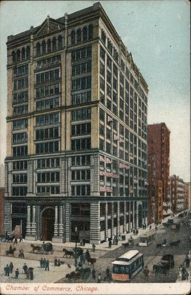 Postcard view of Baumann & Huehl’s Chamber of Commerce Building, formerly at the southeast corner of La Salle and Washington streets.