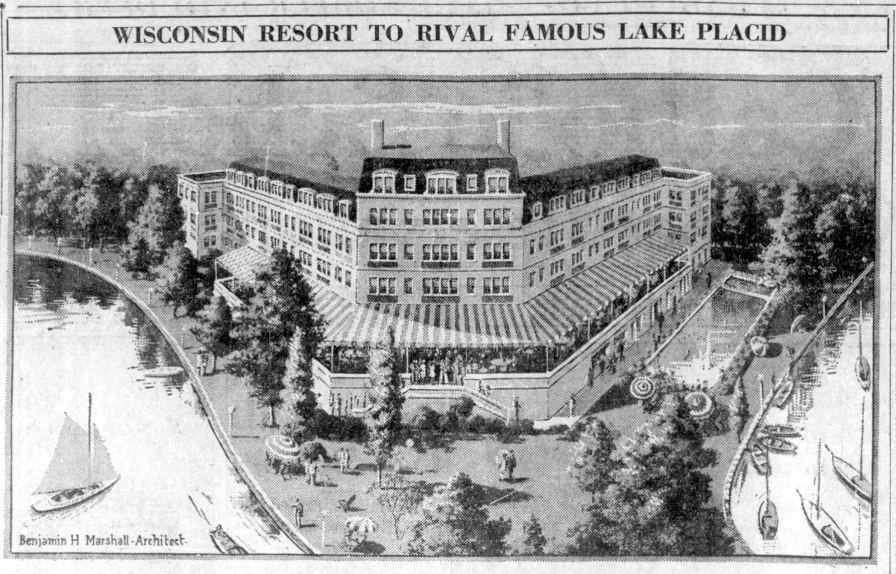 “Wisconsin Resort to Rival Famous Lake Placid,” This Chicago Tribune rendering shows Marshall’s Lawsonia Country Club, now Roger Williams Inn, Green Lake, Wisconsin.