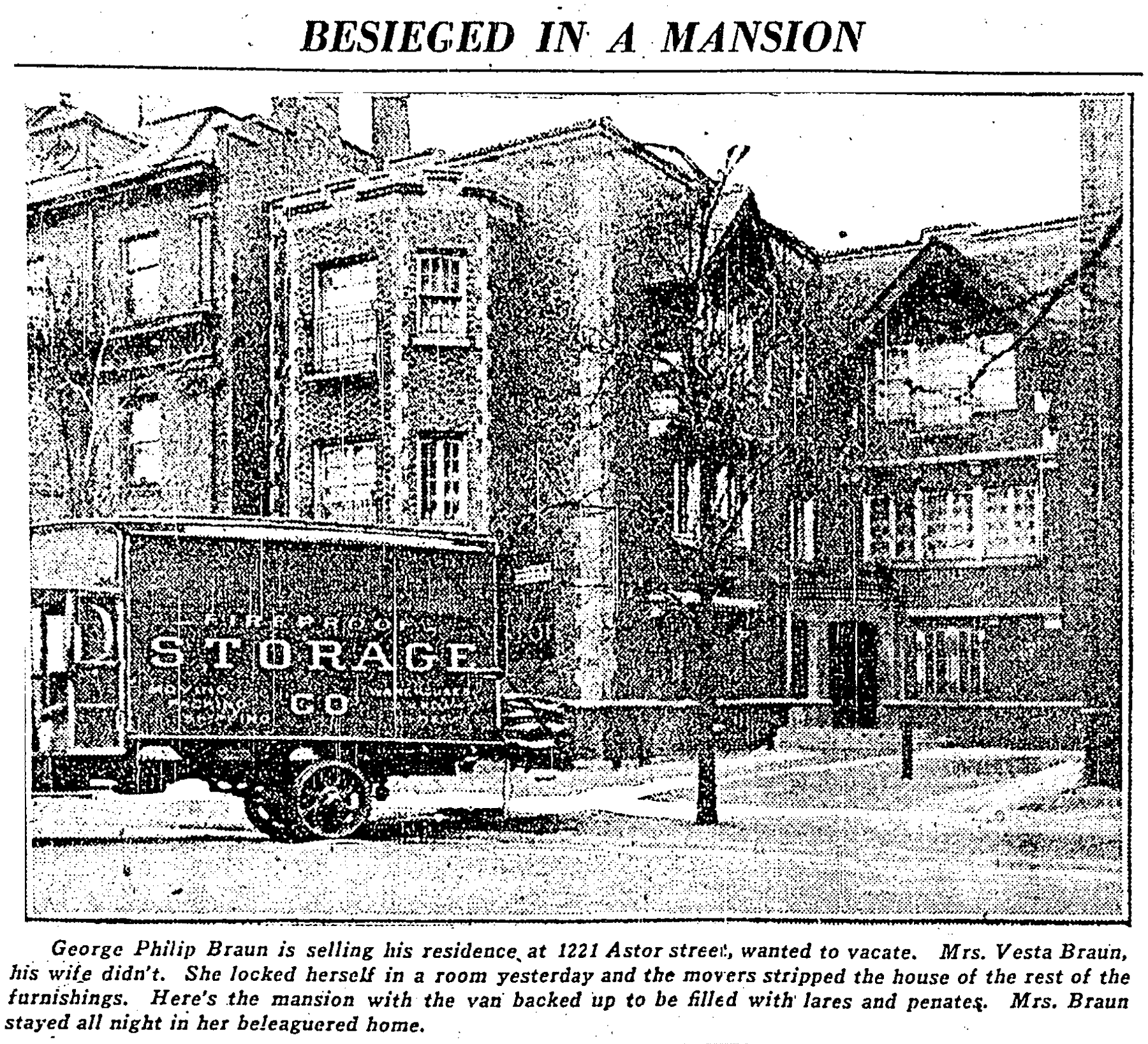 A front-page Chicago Tribune story entitled “Home on Gold Coast in Siege as Wife Sues: Mrs. G.P. Braun Jr. Asks Divorce” explained that Vesta Braun had refused to leave the premises unless her husband agreed to earmark the sale proceeds for her two sons. The article suggested that despite her husband’s substantial wealth, Mrs. Braun had been supporting the family with money from her trust fund.