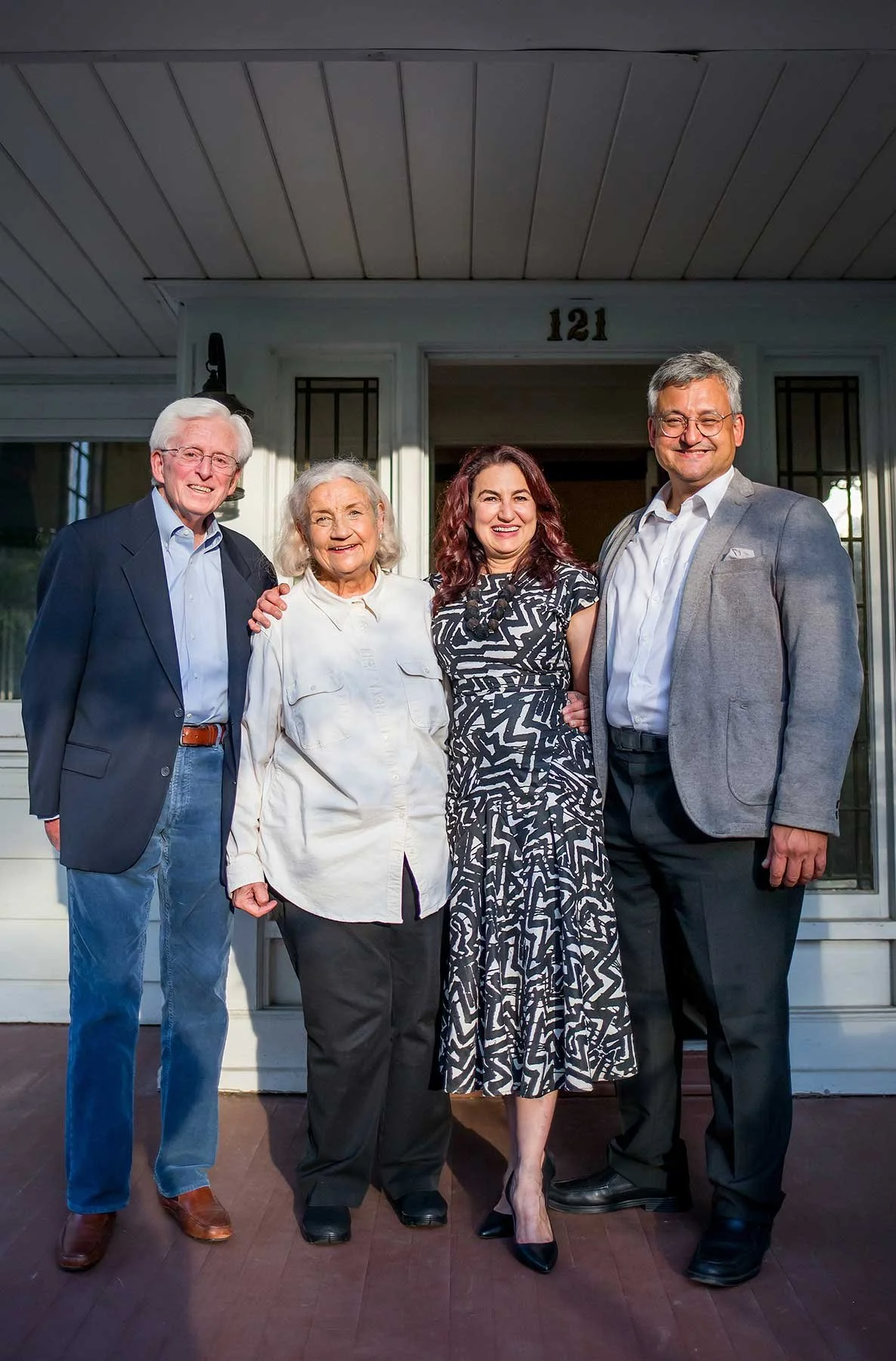 Jerry and Jeannette Goldstone, previous owners (left), and Safina Uberoi and Lukas Ruecker, new owners (right), in front of the Bagley House, 2021. Photo by Marcello Rodarte.