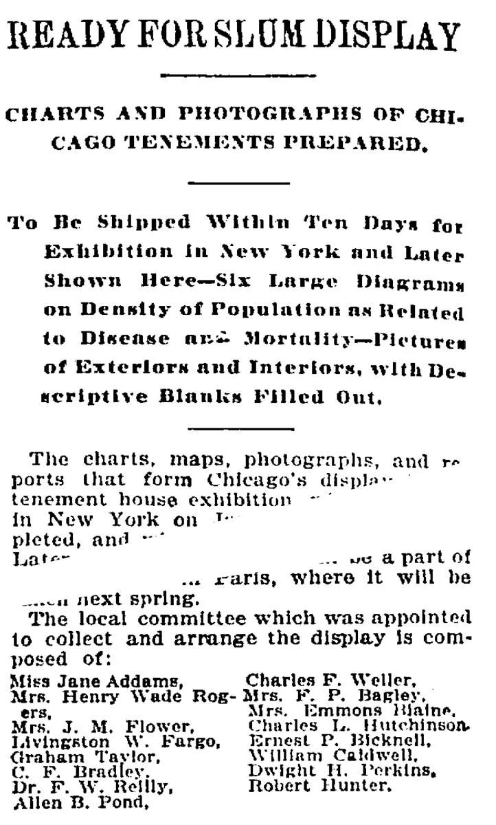 Excerpt from “Ready for Slum Display: Charts and Photographs of Chicago Tenements Prepared,” Chicago Tribune, December 16, 1899.